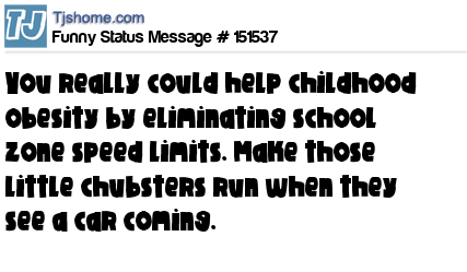 X says You really could help childhood obesity by eliminating school zone speed limits. Make those little chubsters run when they see a car coming.