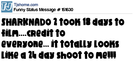 X says SHARKNADO 2 took 18 days to film....credit to everyone... it totally looks like a 24 day shoot to me!!!