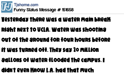 X says Yesterday there was a water main break right next to UCLA. Water was shooting out of the ground for four hours before it was turned off. They say 20 million gallons of water flooded the campus. I didn't even know L.A. had that much water.