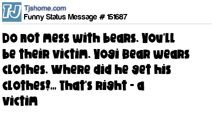 X Do not mess with bears. You'll be their victim. Yogi Bear wears clothes. Where did he get his clothes?,,, That's right - a victim