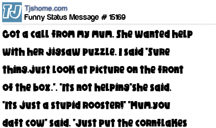 X is Got a call from my mum. She wanted help with her jigsaw puzzle. I said "Sure thing,just look at picture on the front of the box.". "Its not helping"she said. "Its just a stupid rooster!" "Mum,you daft cow" said. "Just put the cornflakes back in the box."
