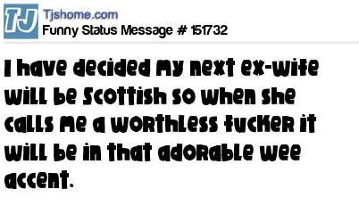 X I have decided my next ex-wife will be Scottish so when she calls me a worthless fucker it will be in that adorable wee accent.