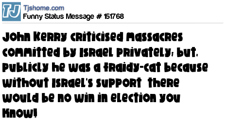 X John Kerry criticised massacres committed by Israel privately; but, publicly he was a fraidy-cat because without Israel's support there would be no win in election you know!