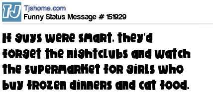 X says If guys were smart, they'd forget the nightclubs and watch the supermarket for girls who buy frozen dinners and cat food.