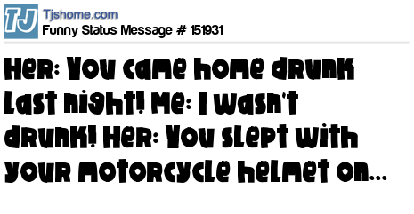 X Her: You came home drunk last night! Me: I wasn't drunk! Her: You slept with your motorcycle helmet on...