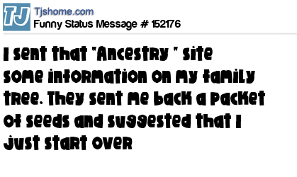 - # 188165 I answered that Ancestry.com ad and asked for some information on my family tree. They sent me back a packet of seeds and suggested that I just start over. FML.