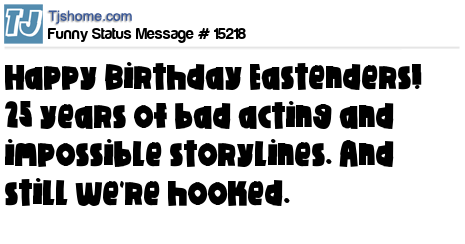 X Happy Birthday Eastenders! 25 years of bad acting and impossible storylines. And still we're hooked.