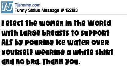 X says I elect the women in the World with large breasts to support ALS by pouring ice water over yourself wearing a white shirt and no bra. Thank you.