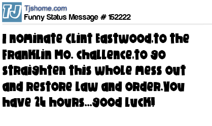 - # 152250 I nominate Clint Eastwood,to the Franklin Mo. challence,to go straighten this whole mess out and restore law and order.You have 24 hours...good lu