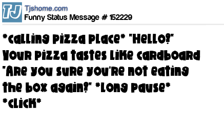 X says *calling pizza place* "Hello?" Your pizza tastes like cardboard "Are you sure you're not eating the box again?" *long pause* *click*