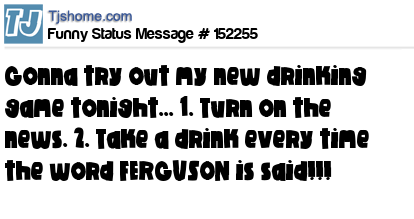 X says Gonna try out my new drinking game tonight... 1. Turn on the news. 2. Take a drink every time the word FERGUSON is said!!!