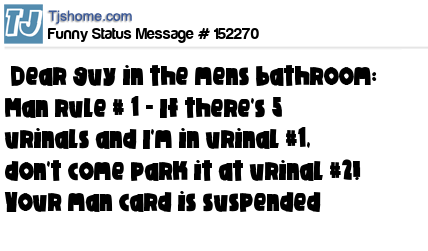 - # 96280 Dear guy in the mens bathroom...* man rule # 1a - if there's 5 urinals and I'm in urinal #1 , dont come parking it at urinal #2 !...your man card is suspended !