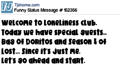 X Welcome to loneliness club. Today we have special guests,,, Bag Of Doritos and Season 5 of Lost... Since it's just me, let's go ahead and start.
