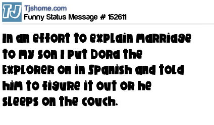 X says In an effort to explain marriage to my son I put Dora the Explorer on in Spanish and told him to figure it out or he sleeps on the couch.