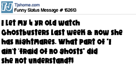 X says I let my 4 yr old watch Ghostbusters last week & now she has nightmares. What part of "I ain't 'fraid of no ghosts" did she not understand?!