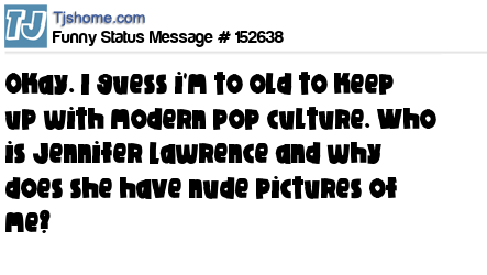 X says okay. I guess i'm to old to keep up with modern pop culture. Who is Jennifer Lawrence and why does she have nude pictures of me?