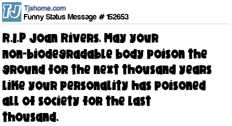 X says R.I.P Joan Rivers, May your non-biodegradable body poison the ground for the next thousand years like your personality has poisoned all of society for the last thousand.