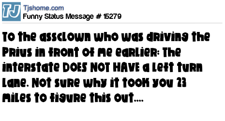 X To the assclown who was driving the Prius in front of me earlier: The interstate DOES NOT HAVE a left turn lane. Not sure why it took you 23 miles to figure this out....