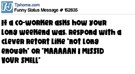 X says If a co-worker asks how your long weekend was, respond with a clever retort like "not long enough" or "MAAAAAN I MISSED YOUR SMELL"