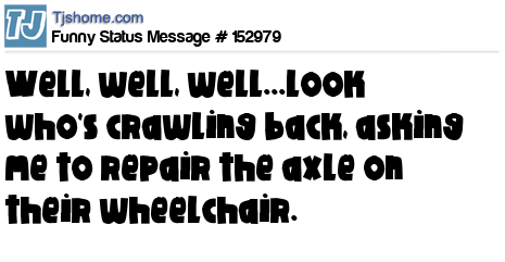 X says Well, well, well...look who's crawling back, asking me to repair the axle on their wheelchair.