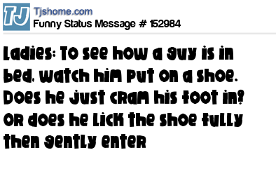 X says Ladies: To see how a guy is in bed, watch him put on a shoe. Does he just cram his foot in? Or does he lick the shoe fully then gently enter