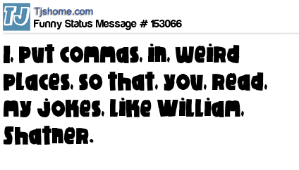 X I, put commas, in, weird places, so that, you, read, my jokes, like William, Shatner.