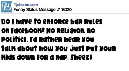 X Do I have to enforce bar rules on Facebook? No religion, no politics. I'd rather hear you talk about how you just put your kids down for a nap. Sheez!