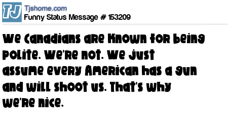X says We Canadians are known for being polite. We're not. We just assume every American has a gun and will shoot us. That's why we're nice.
