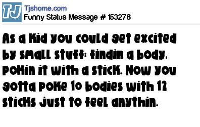 X says As a kid you could get excited by small stuff: findin a body, pokin it with a stick. Now you gotta poke 10 bodies with 12 sticks just to feel anythin.