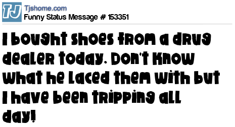 - # 175859 I bought some shoes from a drug dealer. I don't know what he laced them with, but I've been tripping all day.