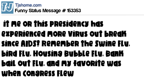X   it me or this presidency has experienced more Virus out break since AIDS? Remember the Swine Flu, bird Flu, Housing Bubble Flu, Bank bail out Flu, and my favorite was when Congress Flew