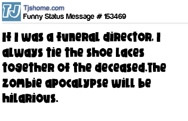 - # 205183 As a funeral director, I always tie the shoe laces together of the deceased.The zombie apocalypse will be hilarious.
