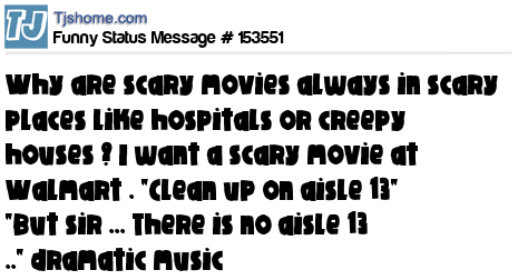 - # 143547 Why are scary movies always in creepy places like jails and hospitals? I want a scary movie in Walmart. CLEAN UP ON AISLE 13. BUT SIR... THERE IS NO AISLE 13. Dramatic music..