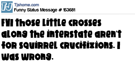 X FYI those little crosses along the interstate aren't for squirrel crucifixions. I was wrong.