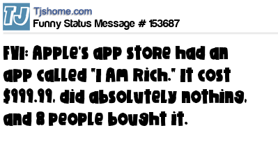 X FYI: Apple's app store had an app called "I Am Rich." It cost $999.99, did absolutely nothing, and 8 people bought it.