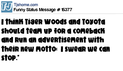 X I think Tiger Woods and Toyota should team up for a comeback and run an advertisement with their new motto: I swear we can stop."