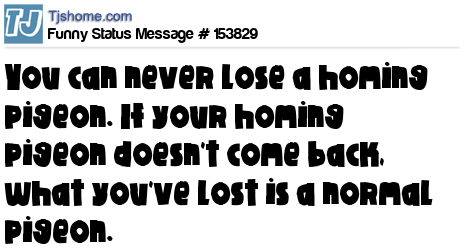 - # 189642 You can never lose a homing pigeon. If your homing pigeon doesn't come back, all you've lost is a regular pigeon.