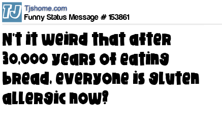 - # 179329 5000 years of eating bread and now all of a sudden everyone's allergic to gluten? WTF?