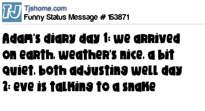 X says adam's diary day 1: we arrived on earth, weather's nice, a bit quiet, both adjusting well day 2: eve is talking to a snake