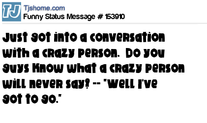 X says Just got into a conversation with a crazy person.  Do you guys know what a crazy person will never say? -- "Well I've got to go."