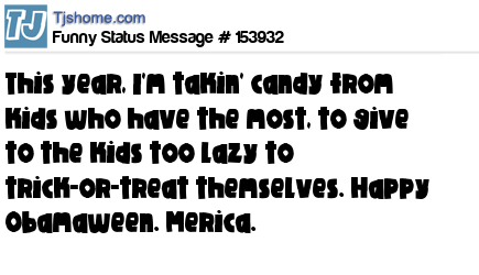 X says This year, I'm takin' candy from kids who have the most, to give to the kids too lazy to trick-or-treat themselves. Happy Obamaween. Merica.