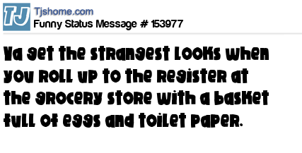 X says Ya get the strangest looks when you roll up to the register at the grocery store with a basket full of eggs and toilet paper.