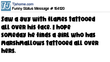 X says Saw a guy with flames tattooed all over his face. I hope someday he finds a girl who has marshmallows tattooed all over hers.