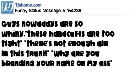 X says Guys nowadays are so whiny,"these handcuffs are too tight" "there's not enough air in this trunk" "why are you branding your name on my ass"