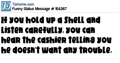 - # 155903 If you hold up a Shell and listen, you should hear the clerk tell you that he doesn't want any trouble.