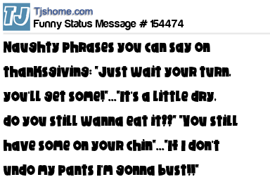 - # 80502 Naughty phrases you can only say on Thanksgiving: Just wait your turn youll get some! You still have a little bit on your chin! Its cool whip time! Its a little dry do you still want to eat it? If I undo my pants I'll burst.