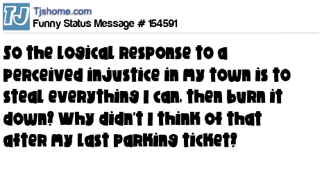 X says So the logical response to a perceived injustice in my town is to steal everything I can, then burn it down? Why didn't I think of that after my last parking ticket?