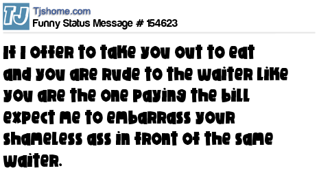 X says If I offer to take you out to eat and you are rude to the waiter like you are the one paying the bill expect me to embarrass your shameless ass in front of the same waiter.