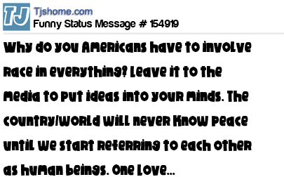 X says Why do you Americans have to involve race in everything? Leave it to the media to put ideas into your minds. The country/world will never know peace until we start referring to each other as human beings. One Love...