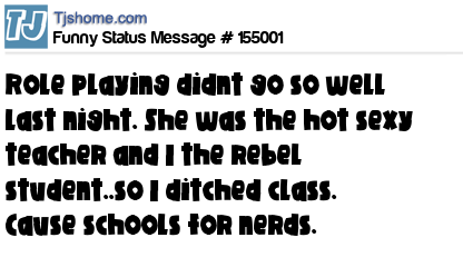 X says Role playing didnt go so well last night. She was the hot sexy teacher and I the rebel student..so I ditched class. Cause schools for nerds.